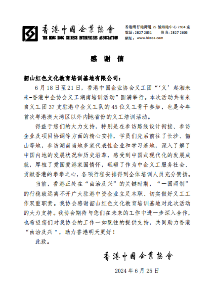 6月25日,韶山紅色文化教育培訓(xùn)基地有限公司收到了來自香港中國企業(yè)協(xié)會(huì)的一封感謝信,信中對(duì)紅培基地在6月18日至21日期間舉辦的“‘義’起湘未來——香港中企協(xié)會(huì)義工湖南培訓(xùn)活動(dòng)”中的周到服務(wù)表示高度贊揚(yáng)。