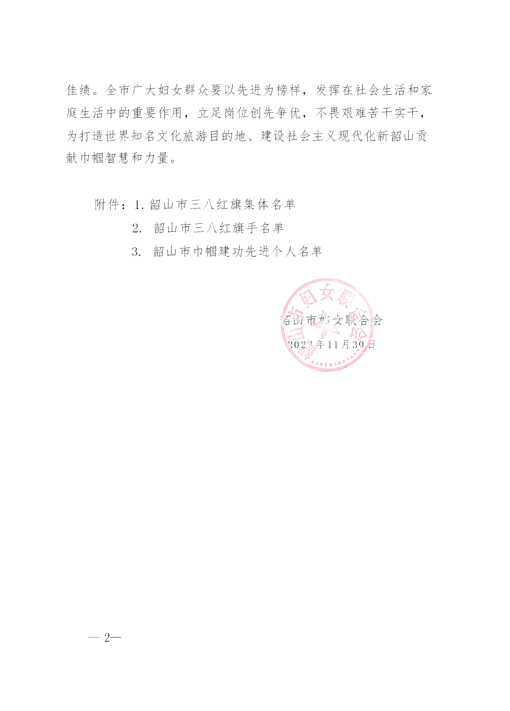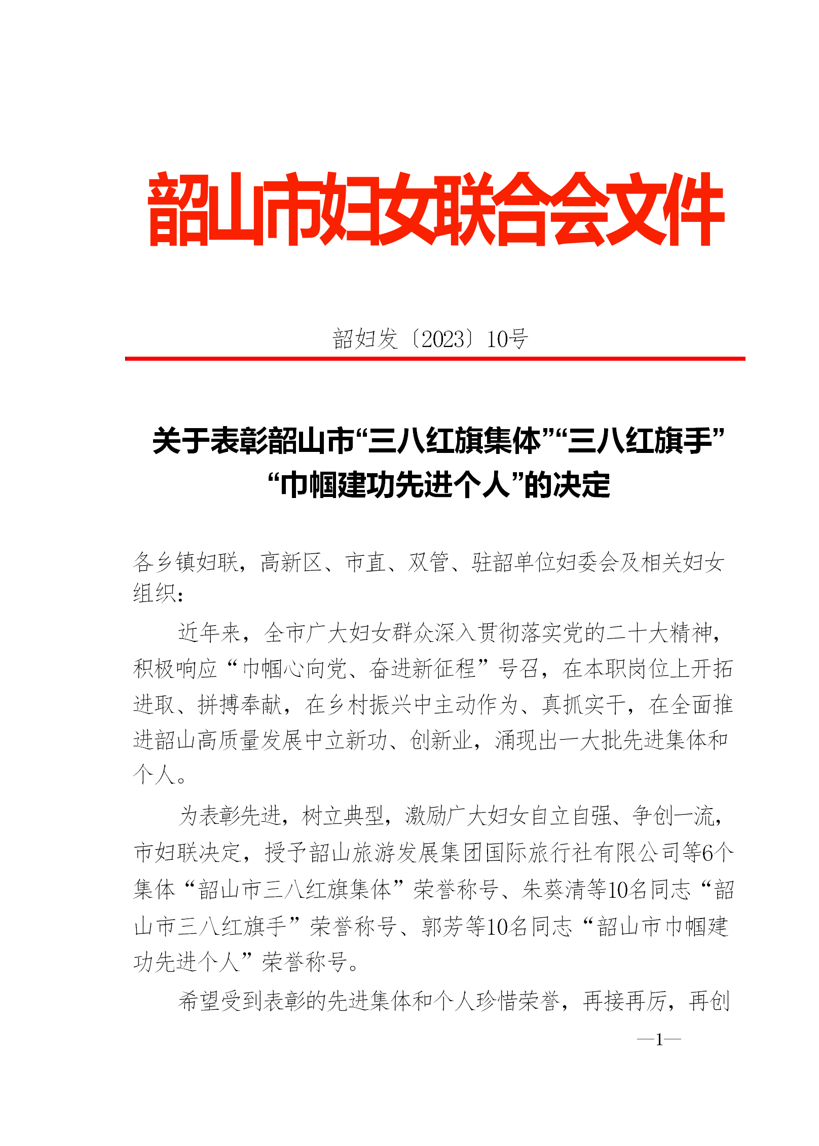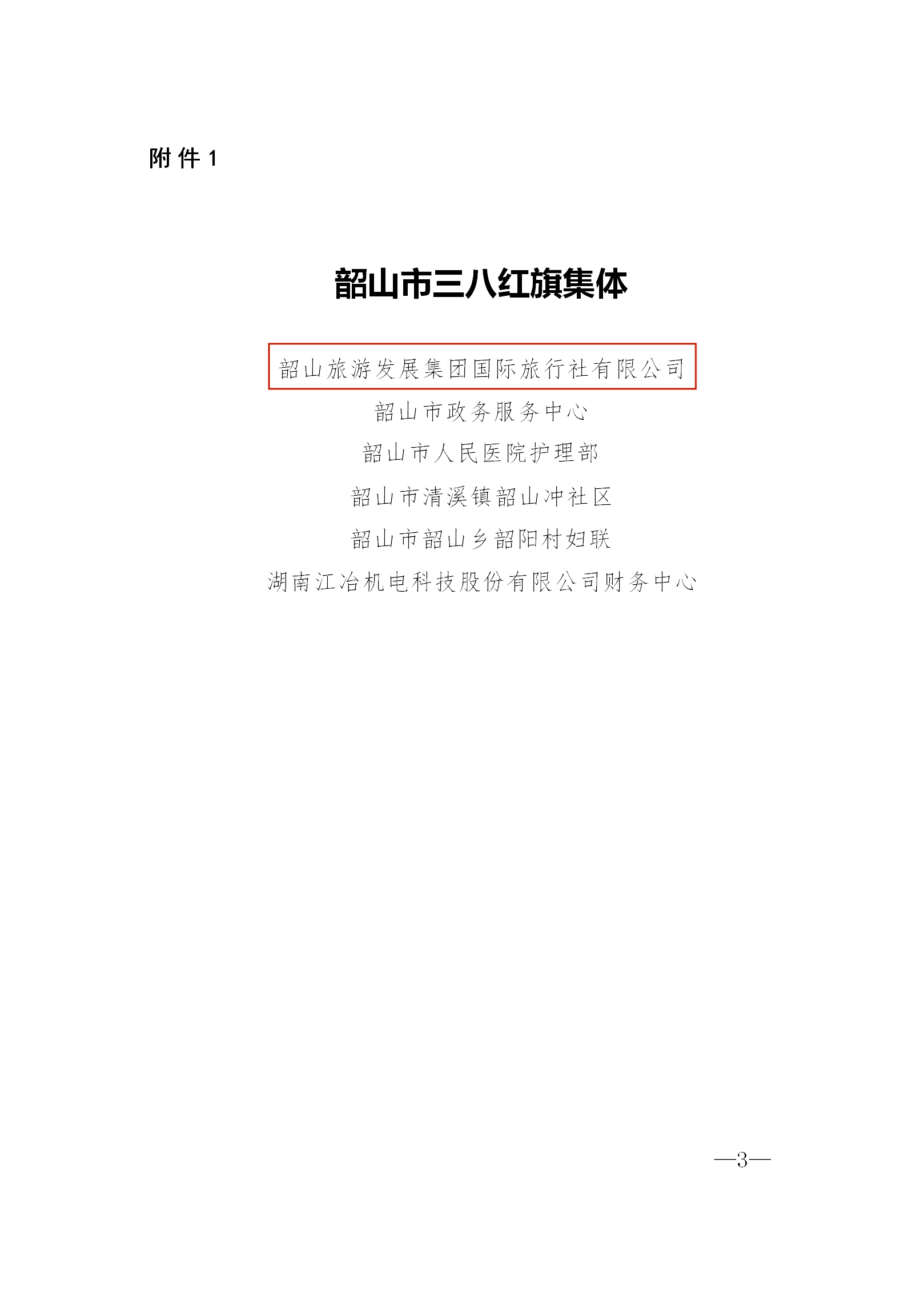 12月12日,韶山市婦聯(lián)印發(fā)《關(guān)于表彰韶山市“三八紅旗集體”“三八紅旗手”“巾幗建功先進(jìn)個(gè)人”的決定》,授予韶山旅游發(fā)展集團(tuán)國(guó)際旅行社有限公司(以下簡(jiǎn)稱韶旅國(guó)際旅行社)“三八紅旗集體”榮譽(yù)稱號(hào)!